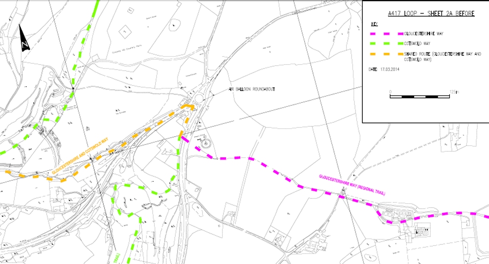 | Back | If you have ever walked the Cotswold Way from Chipping Campden south to Bath, you will surely remember crossing the A417 opposite the Air Balloon Inn, with two lanes of traffic to cross to the central reservation, appearing suddenly from the bend coming uphill towards the roundabout. And if you've ever done the Gloucestershire Way crossing the 4 lane wide road further on up past the pub, you will have taken your life in your hands to cross there. A big campaign has been building up, led by Gloucestershire County Council, to get in the queue to have £250m of Government money to improve the road. See the site here http://a417missinglink.co.uk/ It explains all the reasons for improvement, eg safety, delays, air quality etc but no mention of footpaths! |