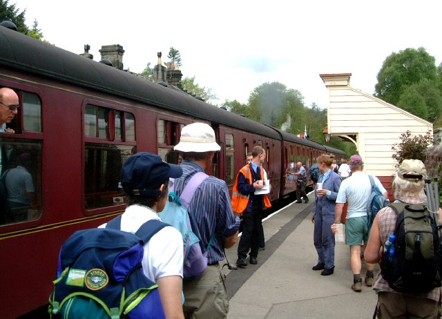 | Excitement indeed today - a 4 mile steam train ride from Grosmont to Goathland, followed by a walk via the spectacular Falling Foss waterfall back to Grosmont. | ||