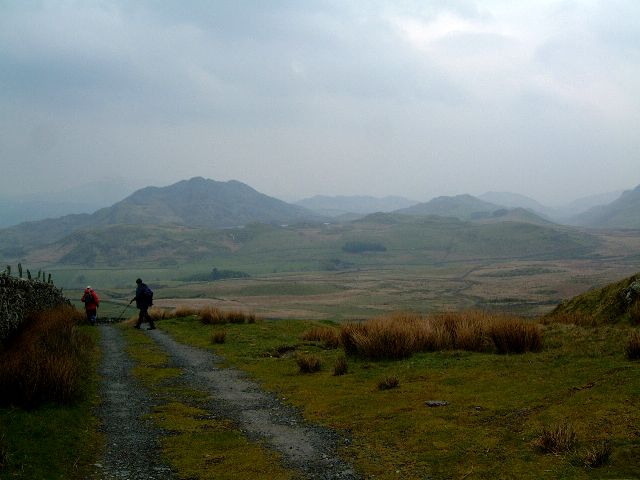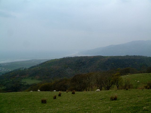 | A breather to look back on our progress so far. It's a cool, misty day, but we keep quite warm climbing. Fairbourne is on the left and Barmouth in the middle distance. | ||