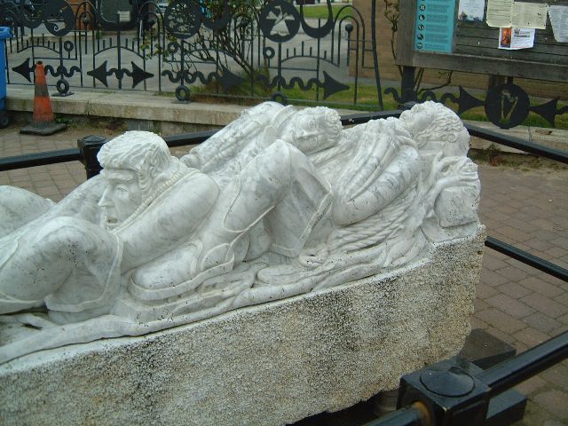 | In Barmouth we pass a marble carving called The Last Haul. In 1719 a ship sank off the coast with 43 marble blocks on board. Recently the wreck was raised, and the divers presented one of the blocks to Barmouth Town Council, who commissioned a local sculptor to produce this extraordinary work of art in honour of the new millennium, sited near the harbour. | ||