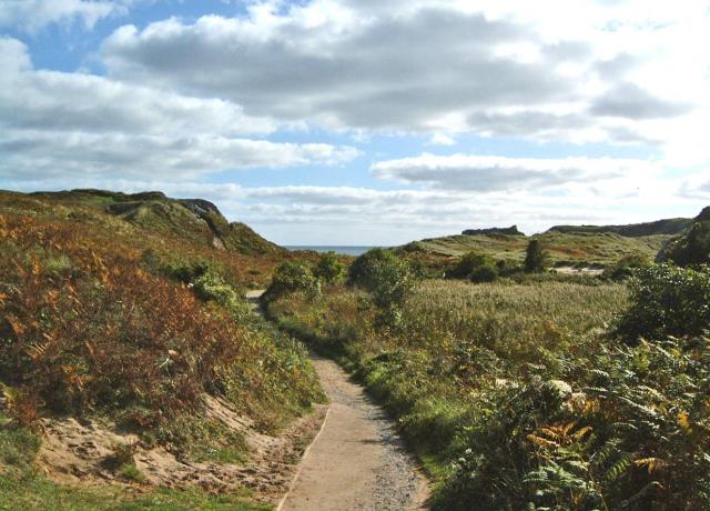 | .Our first glimpse of the sea at Broad Haven. We head through the sand dunes ... | ||