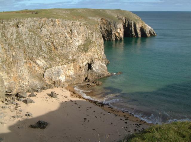 | The sea eats into the cliffs here, forming caves and pinnacles. | ||