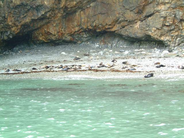| We stop to look at one of the main beaches where the seal pups and their families are based. | ||