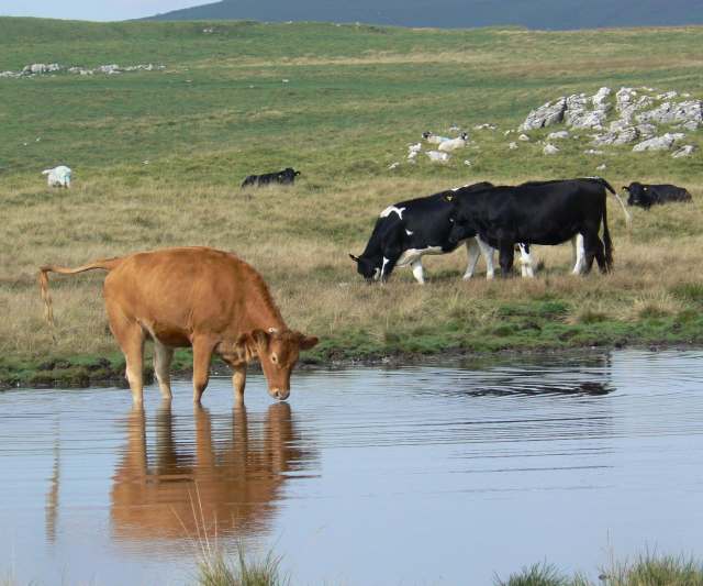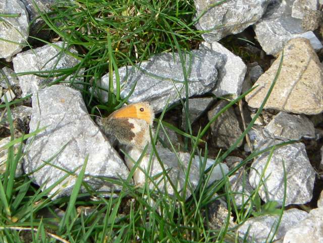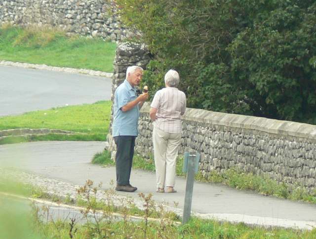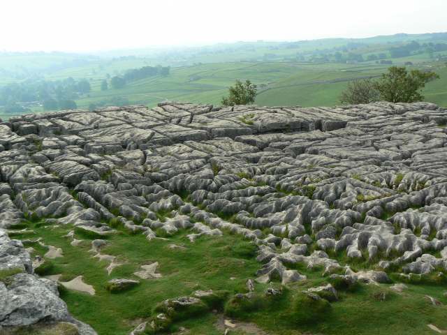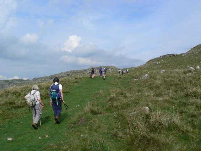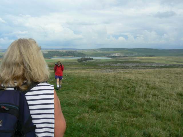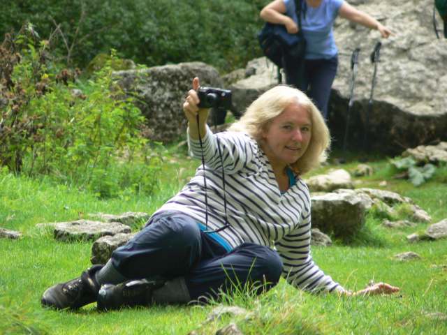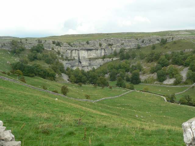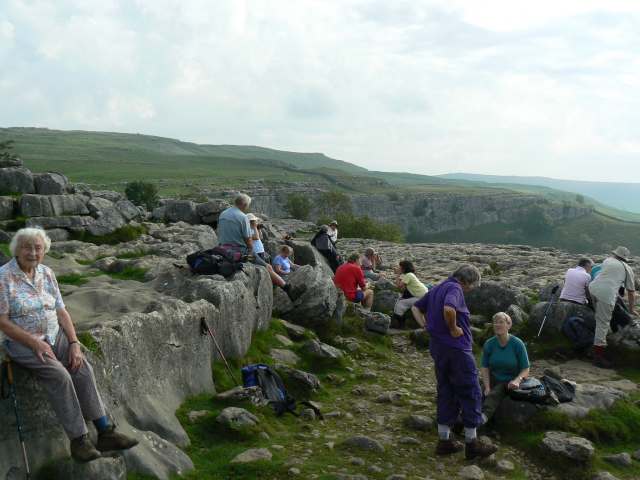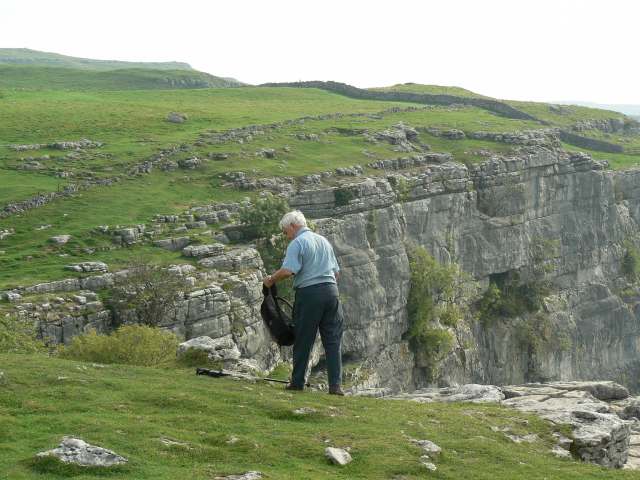 | On Monday, the whole party walked to Malham Cove where the sheer limestone walls towered above them. Mike explained that when the ice-sheet melted a waterfall, higher than Niagara, had cascaded over these cliffs. The 414 steps to the limestone pavements above the cove were then ascended. Many small plants were growing in the sheltered grikes or cavities which had been eroded into the rocks. Lunch was taken by Malham Tarn, where a stream disappears into the ground to emerge some distance below the village of Malham. | ||