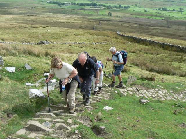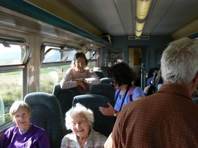 painted and bedecked with flowers. One party left the train at Ribblehead to climb Whernside, the highest point in Yorkshire, and one of the Three Peaks near the famous 24 arches of Ribblehead Viaduct. The rest continued their train journey to visit the attractive town of Appleby. The hill walkers were hard put to get back to Ribblehead station in time for the return train, enjoying the fine views rather too much, but some fine singing raised the pace sufficiently to arrive in the nick of time! |