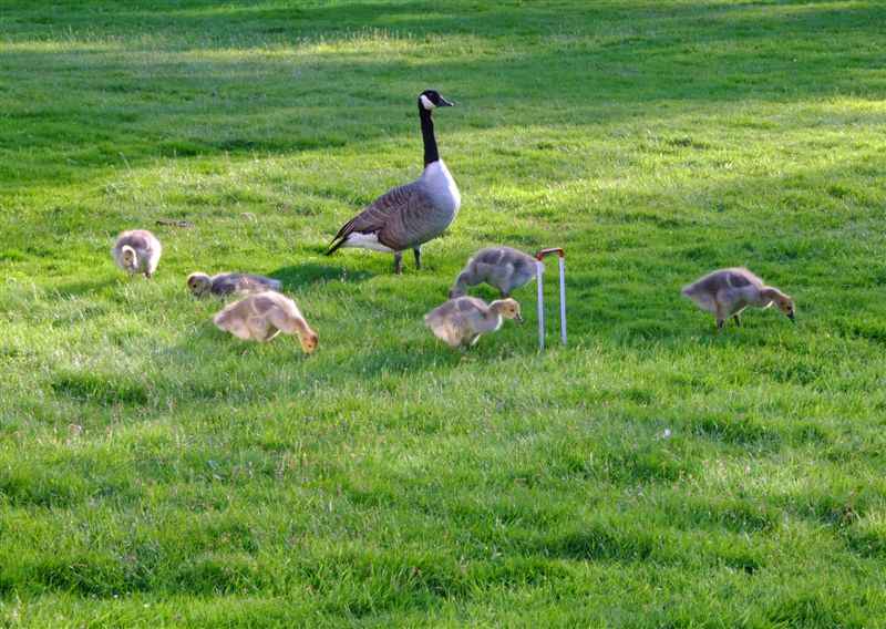 | The early morning view from our room as mother and cygnets look for breakfast | |