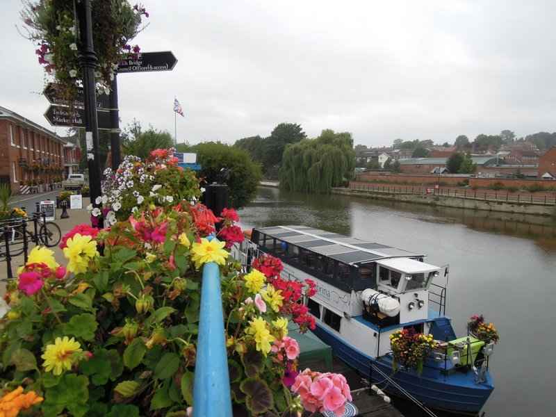 | Some of the many floral displays in the town, here by the river Severn | ||