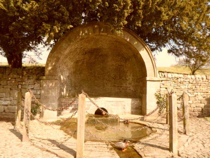 | We descend into Tissington. This is Hall Well, one of the 6 wells that are dressed by pressing flowers and other organic material into clay during Ascension Week. About 50,000 people visit this village for the well-dressing. It was busy enough on the sunny Sunday we were there! | |