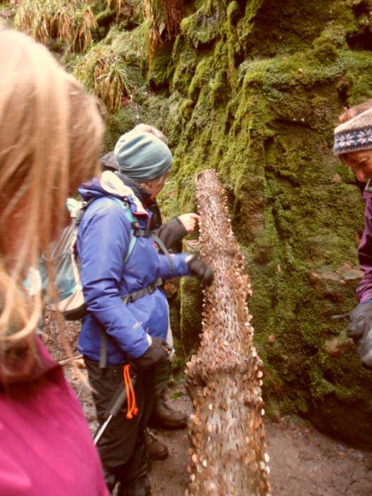 | Helena tries unsuccessfully to remove one of the coins hammered into yet another tree trunk | |