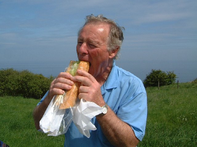 | At mid-morning stop time, Brian, our leader, felt honour bound to test out the baguettes. | ||