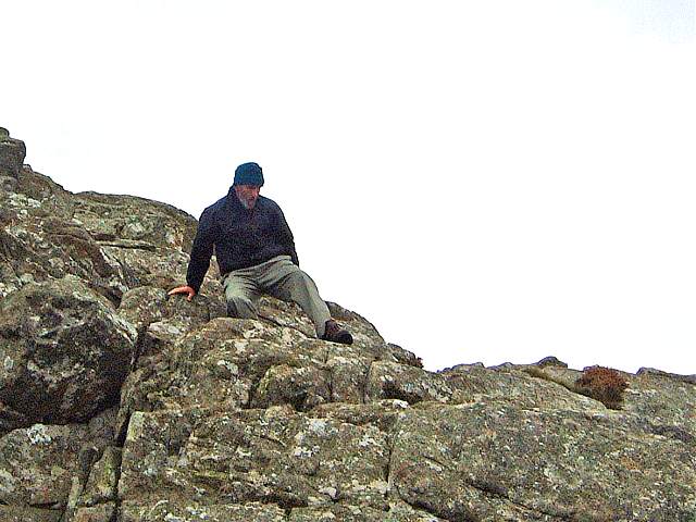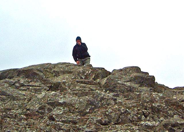 | The last few feet are quite a scramble, and only James makes the summit! | ||