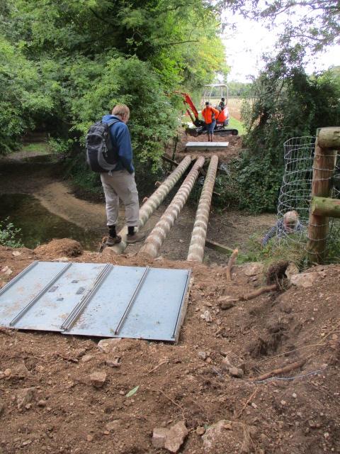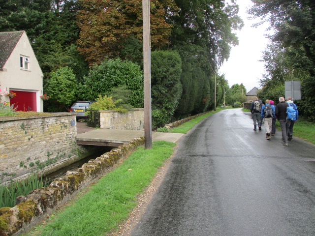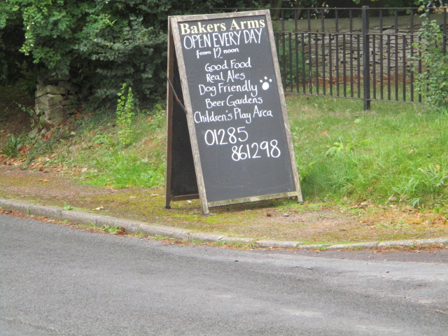Ashton Keynes walk - Saturday 8 September 2018 Previous Next Outside the White Hart Ron tells the tale of Chalkie White of Minchinhampton who was murdered and whose body was found in the nearby lakes It doesn't look dangerous walking through Ashton Keynes today though Alongside the stream And the ducks look peaceful enough Past a house with mosaics And another overlooking the stream Past bullrushes And this lake Which is Somerford Lagoon And has a bird hide Wild hops and elderberries - very British Ron had warned us to be careful crossing the busy Spine Road This is where the path was. Keith was keen to try it but Ros insisted we followed her detour Past another lake Along the side of a field Into Somerford Keynes And the Bakers Arms Dog friendly but NOT walker friendly, as they refused to have our custom for lunch We recross the busy Spine Road Fortunately the path doesn't go there We get to the lake which does Water ski-ing What is this? It houses this UHF aerial cable but no aerial Back to the Thames Path The ducks now on the bank Virginia Creeper looking good We're back into Ashton Keynes And the White Hart which IS walker friendly And Ellison's garage. Photos, captions and uploading by Sally