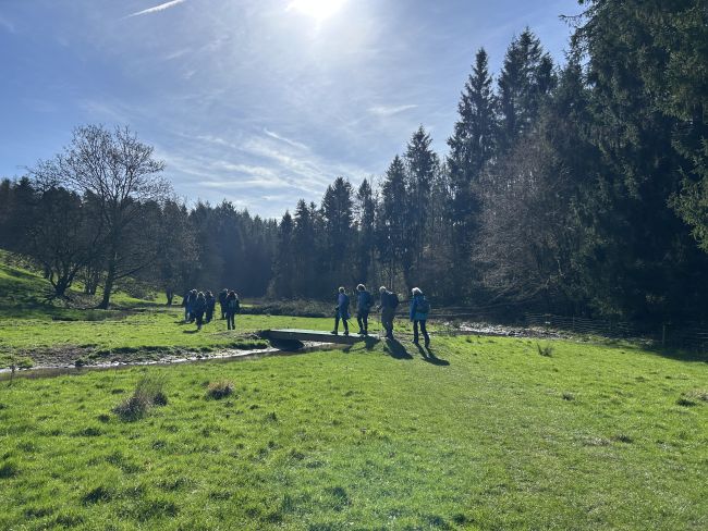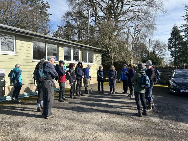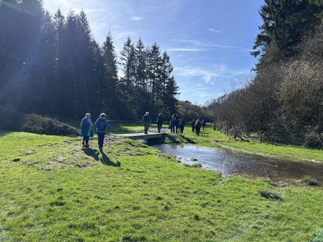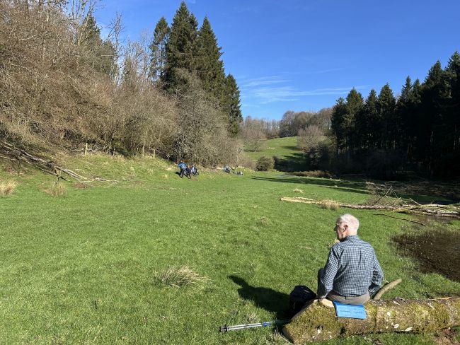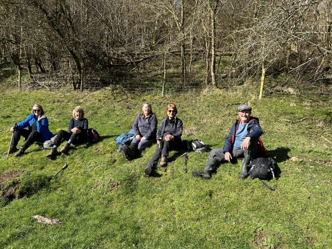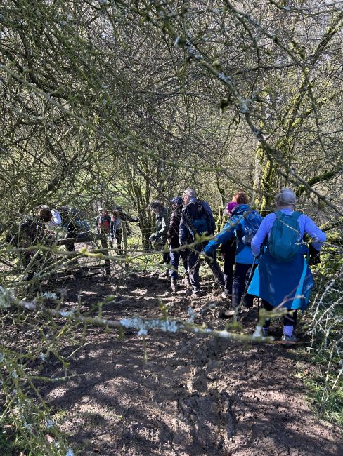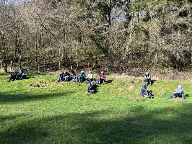 Brimpsfield - Monday 2 March 2026 Previous Next All Hilary tells us about her walk from Brimpsfield Sadly no evidence remains of the castle apart from this plaque Down a country lane to the valley floor A relic from the castle? It’s a slippery descent to an equally slippery stile but we all stay on our feet Where we emerge into a beautiful valley We cross to the left bank Then back to the right on new non slip bridges Where we have coffee in the sun All on the bank Except Nigel who has opted for the deluxe seating further upstream Photos and captions by Loren, uploaded by Sally
