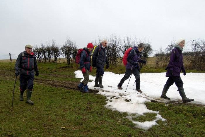 Foston's Ash walk - Saturday 10 March 2018 Previous Next Bill and Penny are our leaders today We set off from Foston's Ash On the high or the low road Through a narrow wood Snow has fallen We now head across a wide lawned bridleway Winter ploughing has been completed We reach the road And start to pass snowdrifts Facing west (the snow came from the east) A very nice new gate We continue Heather is curious No one appears to be buried here A particularly extensive drift An economy measure - we now enter Lord's Wood, further on is Lady's Wood Gorse of course Coffee stop on Sheepscombe Common Belted Galloways are wintering in an adjacent field Yet more snowdrops Far end of Workman's Wood With a pleasant glade We make the long ascent Back to the pub. Some will walk eastwards later, others might be keen on the Six Nations Rugby. Photos, captions, processing and editing by Mike