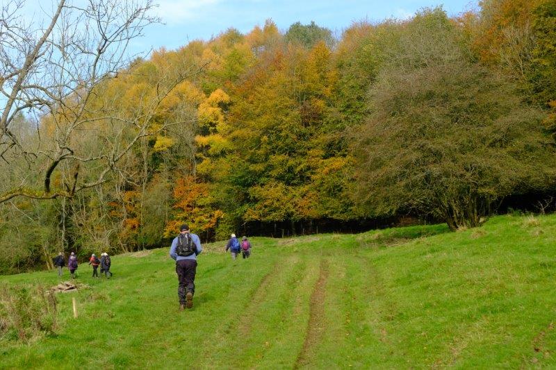 Foston's Ash walk - Wednesday 30 October 2019 Previous Next All Backlit by Autumn sunshine Brian sets the scene for today's walk Our path takes us down through woods And over a stream Along a muddy track Where our progress is halted by people carrying buckets Further investigation reveals they are harvesting crayfish For relocating to other areas. We are given an interesting talk by a member of Gloucestershire Wildlife Trust We eventually continue on our way Plenty of Autumn colour everywhere In the towering beech woods We soon come out onto the top of the hill And into Caudle Green We head down into the valley Before making our way back up Brian ducks under an electric fence kindly held up by Lawrence A rowan tree, I believe On through the village Before following a grassy track back out Past a polo yard And down through another beech wood With more vivid colours Before heading back uphill to the start Photos and captions by Richard, uploaded by Sally