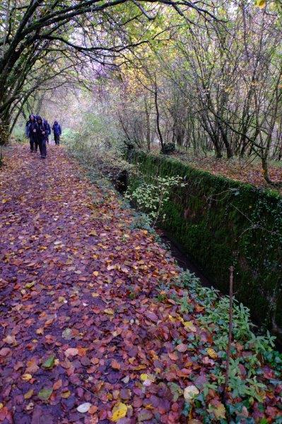 Frampton Mansell walk - Wednesday 6 November 2019 Previous Next All On a roadside near Frampton Mansell - Jill with a pensive look on her face Heading down into the valley Pressing on along a muddy track A stile takes us into a field And we go uphill On a grassy track Past an old oak tree And on round the side of a hill to Iles Green Lots of colour in the trees Our path takes us close to a farm Eventually bringing us to Daneway Banks where we stop for coffee Before heading off to Dorvel Woods Over a stream Looking back to Pinbury Park An uphill slog follows From the top more views across the valley Before continuing across a field Onto a muddy path Then to Sapperton Church where we stop for lunch After lunch it's downhill To Daneway Portal And along the canal To the Daneway Continuing along the canal below Siccaridge Woods Past disused locks A narrow bridge across the canal Then on along the towpath To Whitehall Bridge Lichen covered branches Heading up the valley Some flooding down in the bottom Horses stand and stare Spindleberry Someone has found a friend Safely over the level crossing And up past The Crown Another look at the Frampton Mansell bus stop before making our way back to the cars Photos and captions by Richard, uploaded by Sally