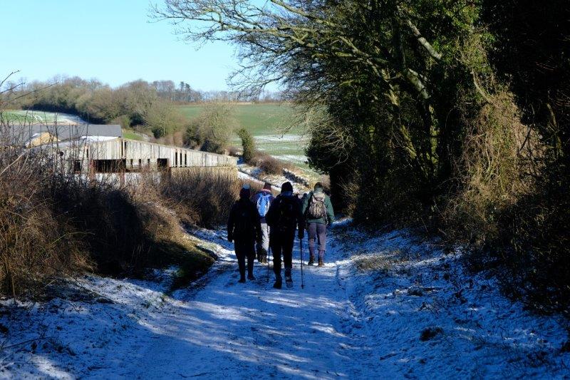 Highwayman walk - Wednesday 7 February 2018 Previous Next Stagecoach? We must be at the Highwayman We have had rain and mud. Now it is snow. Next earthquake, sunami or pestilence Landscape looks very different Following a wider farm track A gap opening up A small valley over to our right Ice has broken, leaving mud underneath Brian looking happy Into Winstone - gingerly crossing an icy road Posh village. Posh sign Snow clinging to the bushes Preparing to walk along an icy road Through the village Then over a stile into a field And down a valley in the morning sun With their walking poles they coud almost be skiing Today's snowdrop shot. Plenty of plants but the flowers haven't come out yet We pause on the Green at Duntisborne Abbots To let the back marker catch up Continuing through the village Past a novel "Go slow" sign Following another farm track Under the eye of the neighbourhood watch Then over a field And back into Winstone Retracing our steps Back to the Highwayman Who is waiting for us Photos and captions by Richard, processed and uploaded by Sally