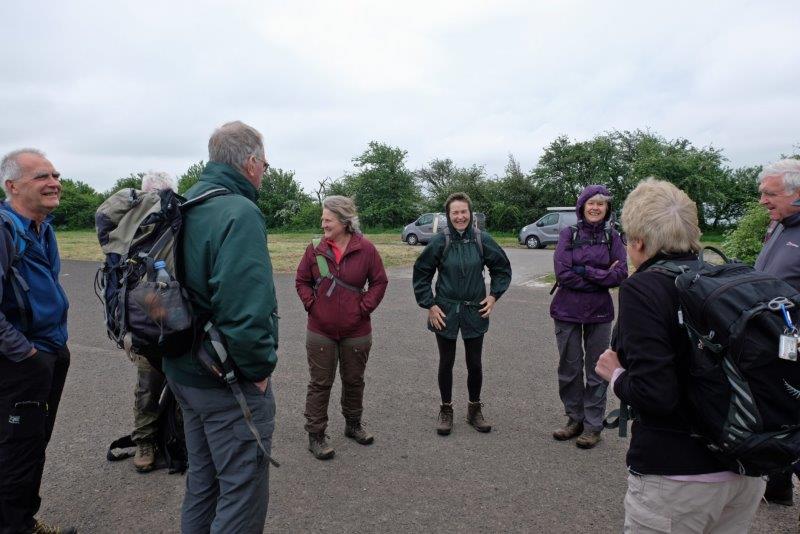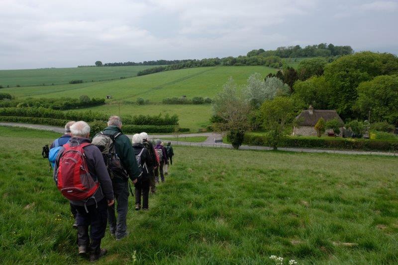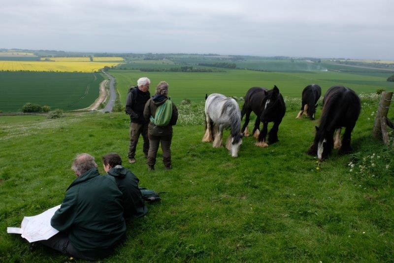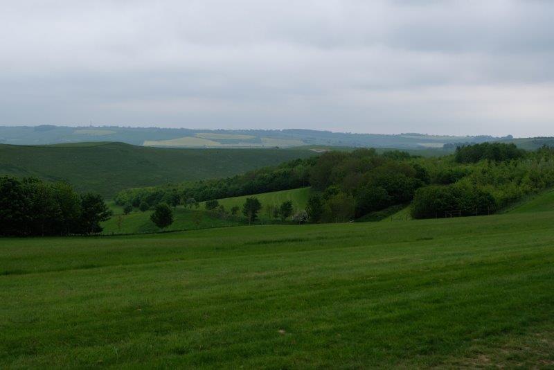 Marlborough Downs walk - Wednesday 16 May 2018 Previous Next It's a bit bleak up here on the Downs where Franceska is waiting to greet us And we set off on a good wide track Chance to look at the rolling contryside Lots of signs of racing But plenty of colour on a gloomy day At least the path ahead is clear A field of rape providing a bit more colour A pause to gaze at a very large muckheap A brief descent To enter the village of Rockley Where there is a duckpond and ducks A nice spot for coffee Then we head uphill to Fyfield Down With its Sarsen Stones, one of the most important neolithic sites in Britain Our leader tries to kid us the stones are sheep A straight path Also some wayside bluebells With more as we pick up the Ridgeway We stop at one of the White Horses, only 200 years old And built by the boys of Marlborough College I'm not a white horse And I'm a grey with a foot fetish And we have come to join you for lunch We continue along the Ridgeway One of the many clumps of trees forming the familiar Marlborough Downs skyline And there is our destination, Barbury Castle Where all paths meet Part of the old fortifications round the edge of the old hill fort Photos and captions by Richard, uploaded by Sally