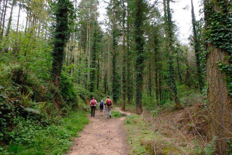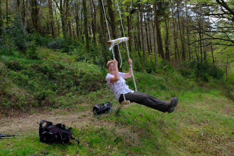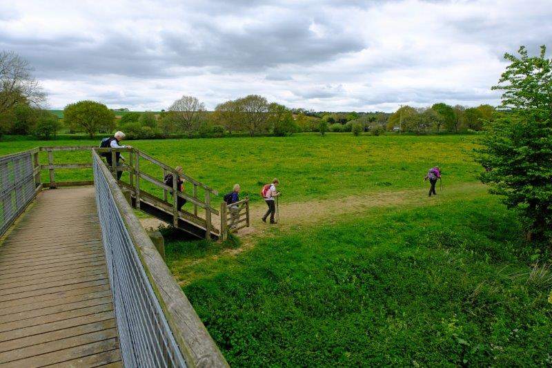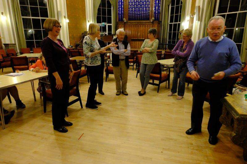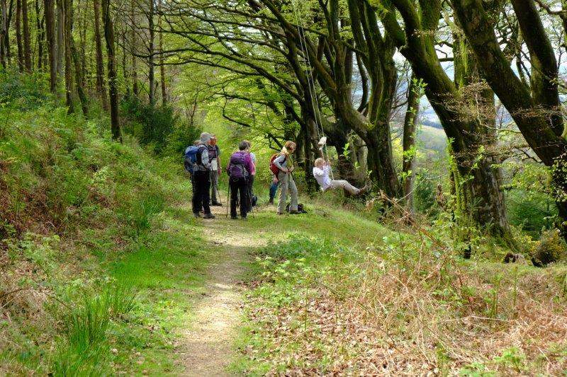 Thursday 27 April 2017 - Inland walk to Ottery St. Mary longer walk and entertainment Previous Our last walk this time heading North on the Byes and the Sid Up to Sidford Ready for Brexit Following a narrow road out of town As we head uphill Looking across to Sidbury Castle Now on a dirt track Continuing to climb Cows peacefully grazing into bluebell woods Plenty of them here Reaching the top To start our descent On a steep path More bluebells Looking down to the outskirts of Sidmouth A stone plantation? Harpford and Newton Poppleford below us As we make our way along the top of the hill To White Cross where we look out over Ottery St Mary and the hills of Dartmoor Descending we encounter a swing A chance for the children to show off Who can swing the highest? Full marks for style Continuing down into the valley where trees are blossoming A bit of the Coleridge Link Farmers have been making patterns in their fields Reaching the River Otter A very tall early purple orchid Still on the Otter We cross over To the opposite bank To look at a sluice An old railway bridge A little egret sees us coming And heads for the trees A beaver has had a go at this tree Our route takes us into Harpford And then into Harpford Woods Crossing a stream which proves something of a challenge before heading on to Bowd to catch a bus This evening is all fun and games Involving, amongst other things, magnetic darts Which brings out the best in some. A bulls eye Sue looks pleased Enid trying to emulate her And afterwards we have the prize giving where all participants receive a Mars Bar Photos and captions by Richard, processed and uploaded by Sally